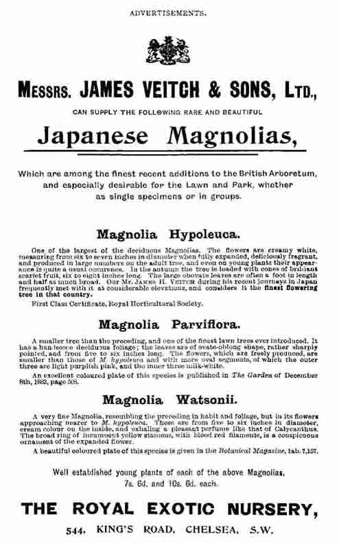 ASIMINA TRILOBA.—Virginian Papaw. Pennsylvania, 1736. This is a curious and uncommon shrub that one rarely sees outside the walls of a botanic garden. The flowers are dark purple or chocolate brown, fully 2 inches across, and succeeded by a yellow, oblong, pulpy fruit, that is relished by the natives, and from which the name of North American Custard Apple has been derived. In this country it is quite at home, growing around London to quite 12 feet in height, but it wants a warm, dry soil, and sunny sheltered situation. As a wall plant it does well.