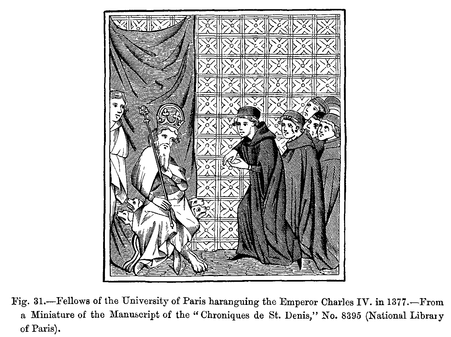 Fig. 411.--Costume of Charles the Simple (Tenth Century).--From a Miniature in the "Rois de France," by Du Tillet, Manuscript of the Sixteenth Century (Imperial Library of Paris).