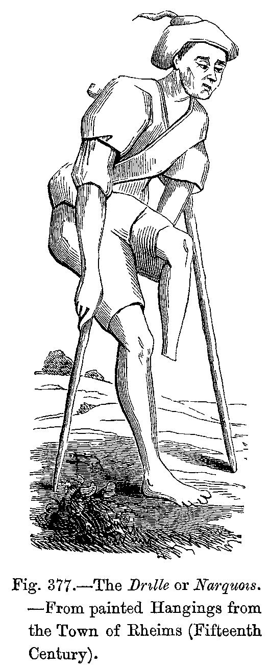 With the aid of our learned guide we have now reached a period (end of the thirteenth century) well adapted for this general study of the dress of our ancestors, inasmuch as soon afterwards men's dress at least, and especially that of young courtiers, became most ridiculously and even indecently exaggerated. To such an extent was this the case, that serious calamities having befallen the French nation about this time, and its fashions having exercised a considerable influence over the whole continent of Europe, contemporary historians do not hesitate to regard these public misfortunes as a providential chastisement inflicted on France for its disgraceful extravagance in dress.