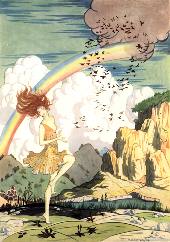 Then Angus Óg put upon his bride glorious raiment, and they went out to the sunlight. It was the early morning, the sun had just risen and the dew was sparkling on the heather and the grass. There was a keen stir in the air that stung the blood to joy, so that Caitilin danced in uncontrollable gaiety, and Angus, with a merry voice, chanted to the sky and danced also. About his shining head the birds were flying; for every kiss he gave to Caitilin became a bird, the messengers of love and wisdom, and they also burst into triumphant melody, so that the quiet place rang with their glee. Constantly from the circling birds one would go flying with great speed to all quarters of space. These were his messengers flying to every fort and dún, every rath and glen and valley of Eiré to raise the Sluaige Shee (the Fairy Host). They were birds of love that flew, for this was a hosting of happiness, and, therefore the Shee would not bring weapons with them.