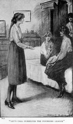 To understand Ingred's perplexities we must give a brief account of the fortunes of her family up to the time this story begins. Mr. Saxon was an architect, who had made a good connection in the town of Grovebury. Here he had designed and built for himself a very beautiful house, and had liberally entertained his own and his children's friends. When war broke out, he had been amongst the first to volunteer for his country's service, and, as a further act of patriotism, he and his wife had decided to offer the use of "Rotherwood" for a Red Cross Hospital. The three boys were then at school, Egbert and Athelstane at Winchester, and Hereward at a preparatory school; so, storing the furniture, Mrs. Saxon moved into rooms with Quenrede and Ingred, who were attending the girls' college in Grovebury as day boarders. For the whole period of the war this arrangement had continued; Rotherwood was given over to the wounded soldiers, and Mrs. Saxon herself worked as one of their most devoted nurses.