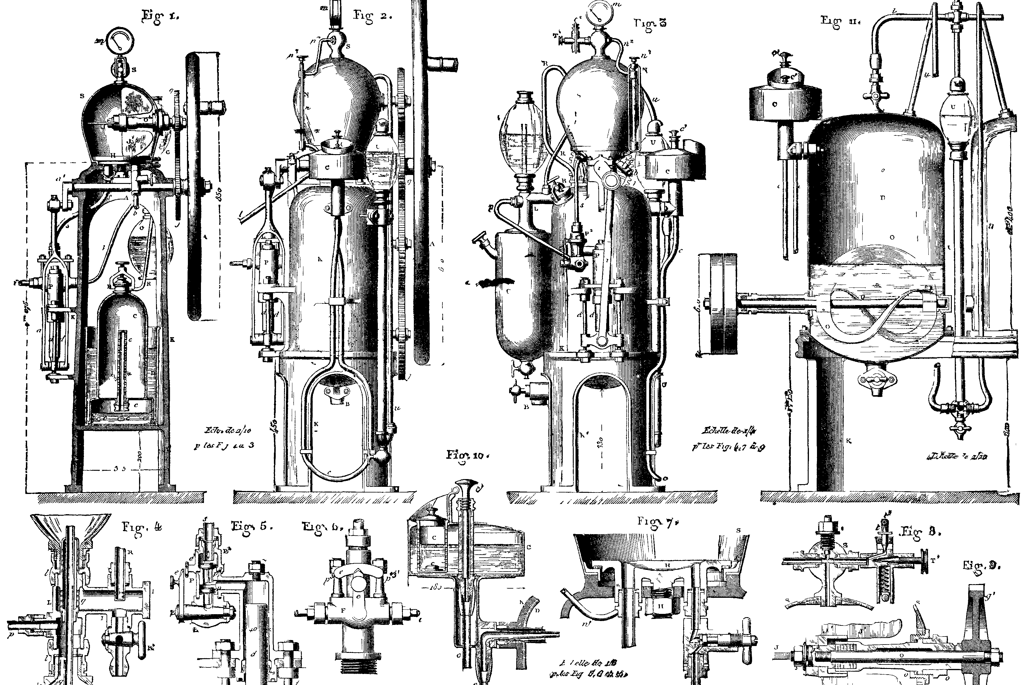 Each of the generators communicates by special pipes, a, with a single safety vessel, V, that operates the same as in the preceding apparatus. The agitator, Q, is of bronze, and is curved as shown in Fig. 11.