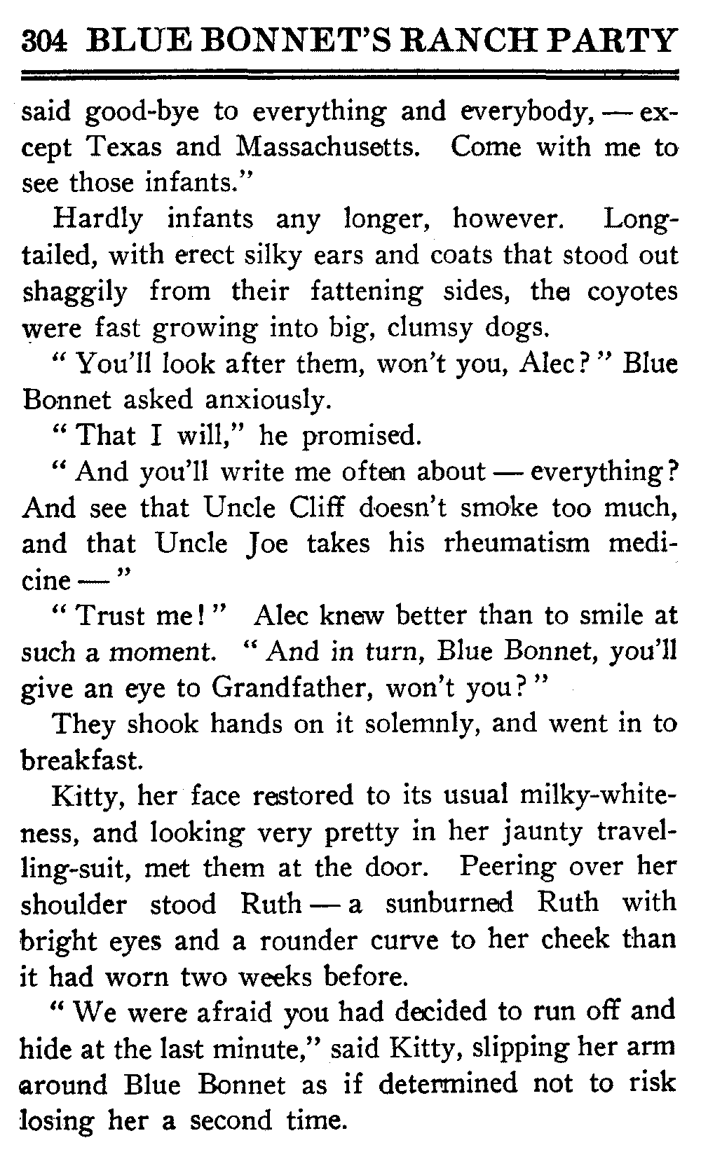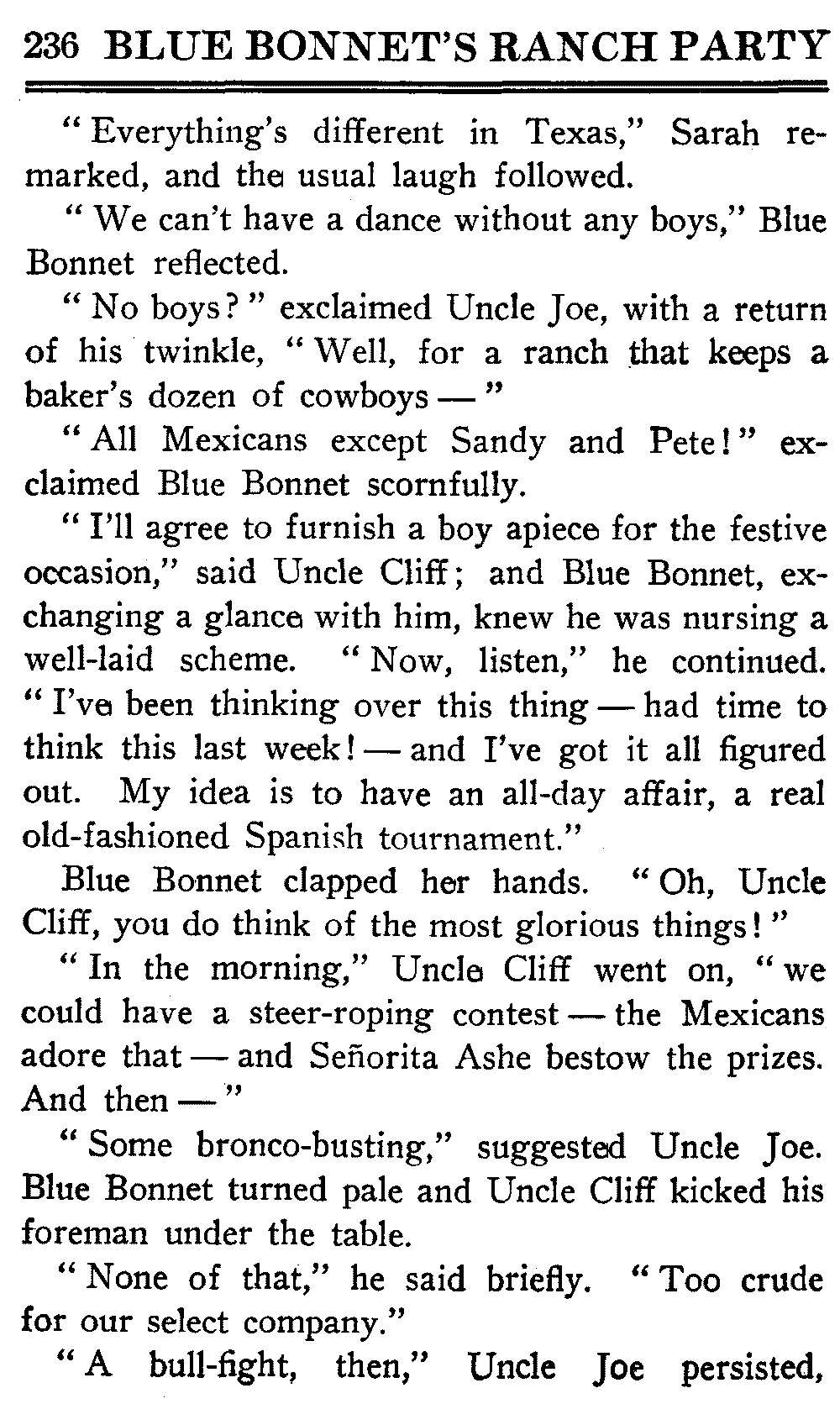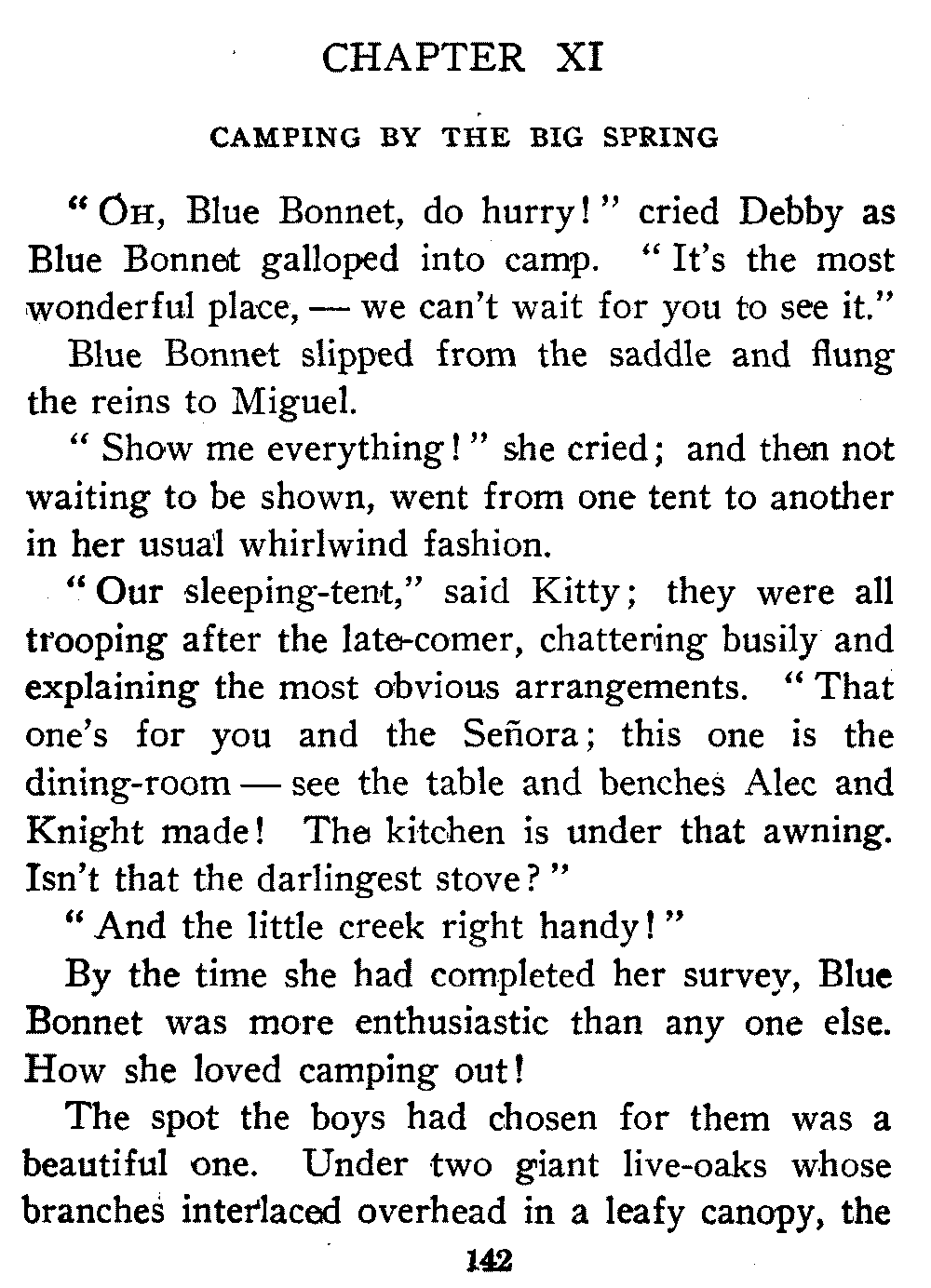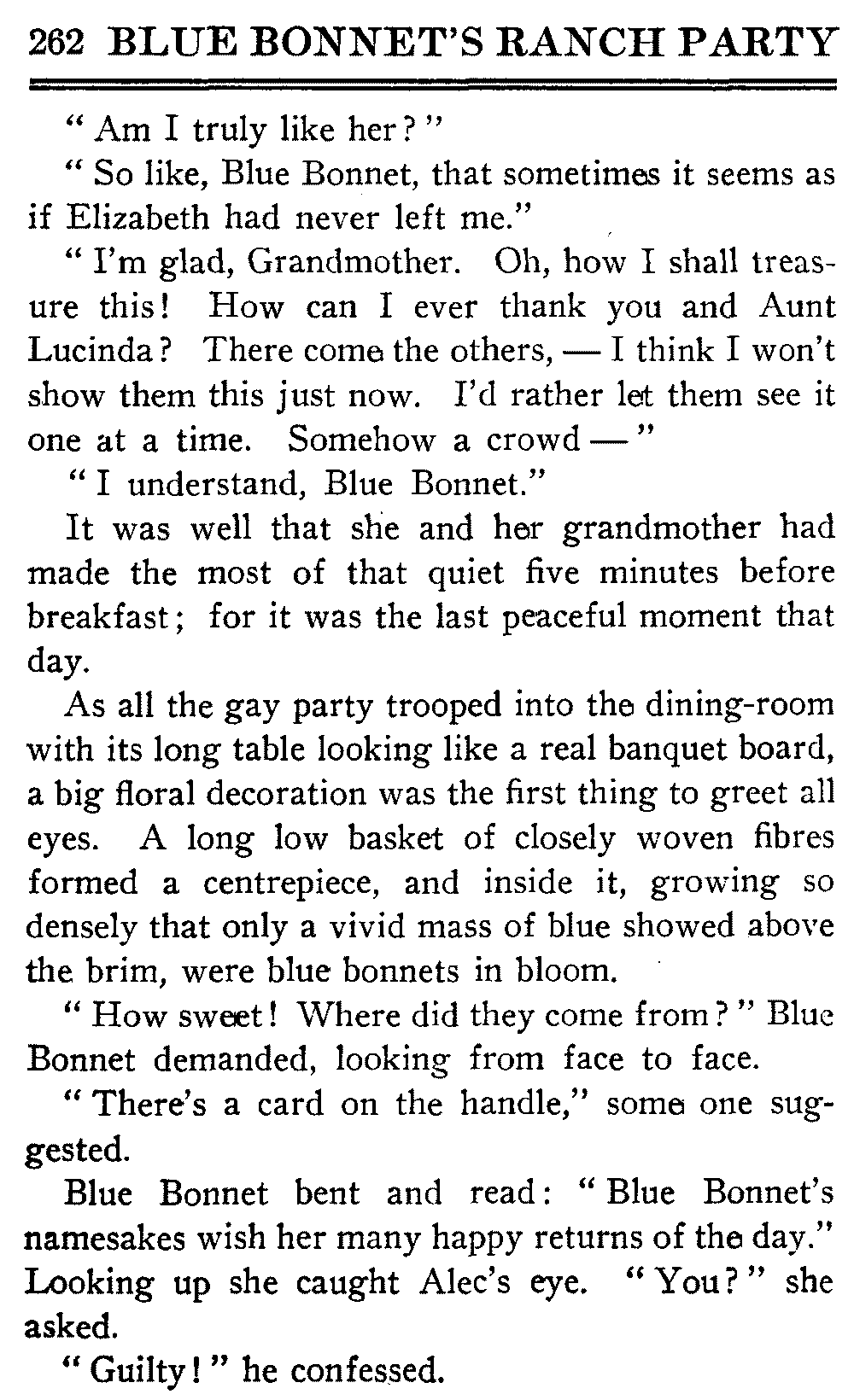 "Oh, I do think a ranch party is the grandest thing in the world," cried Blue Bonnet. "I've read of house parties, but they must be downright tame[4] compared with this kind of a party. And it's not to last just over a week-end either, but two whole months! Why, Uncle Cliff, any ordinary man would be scared to pieces at the prospect."