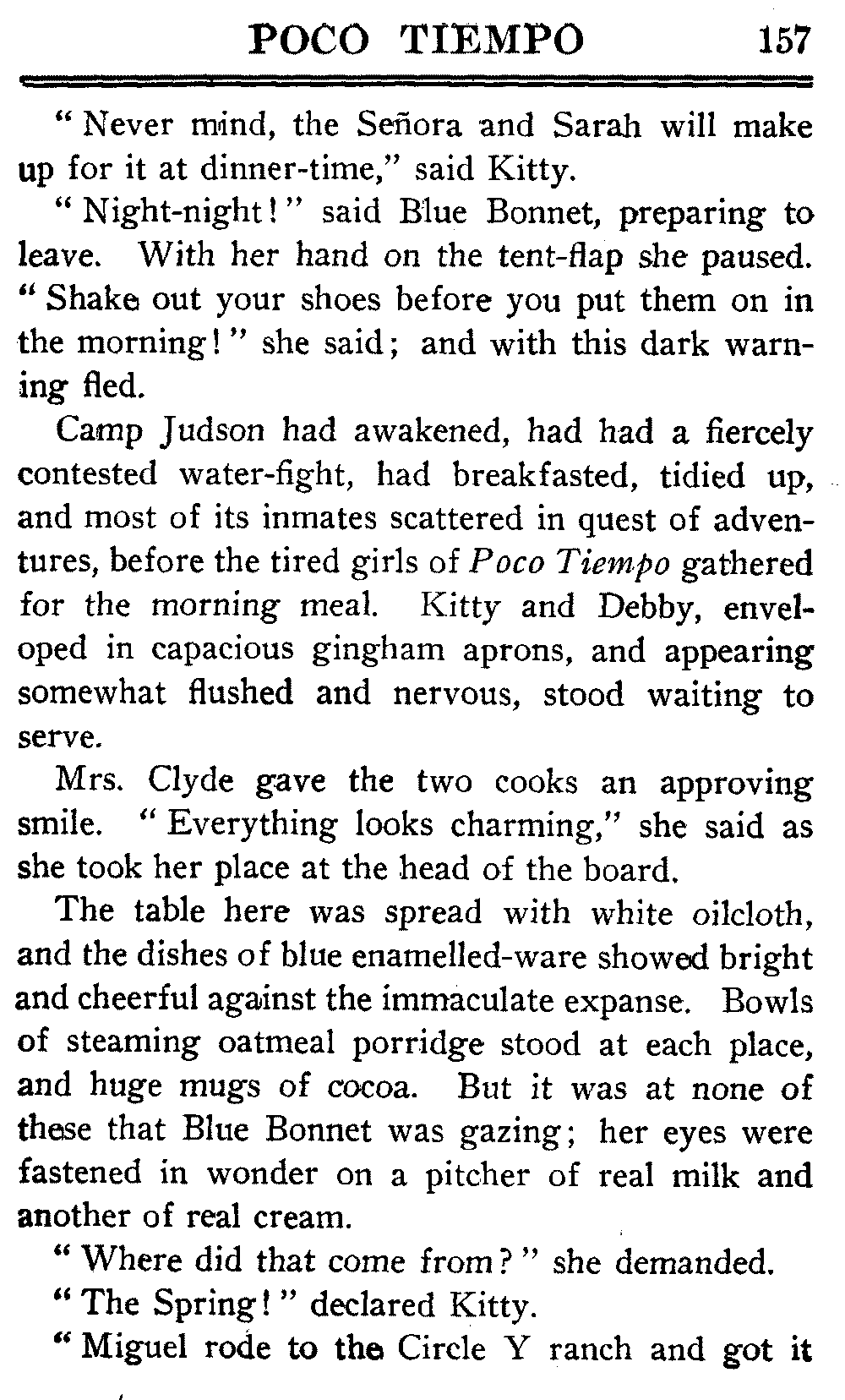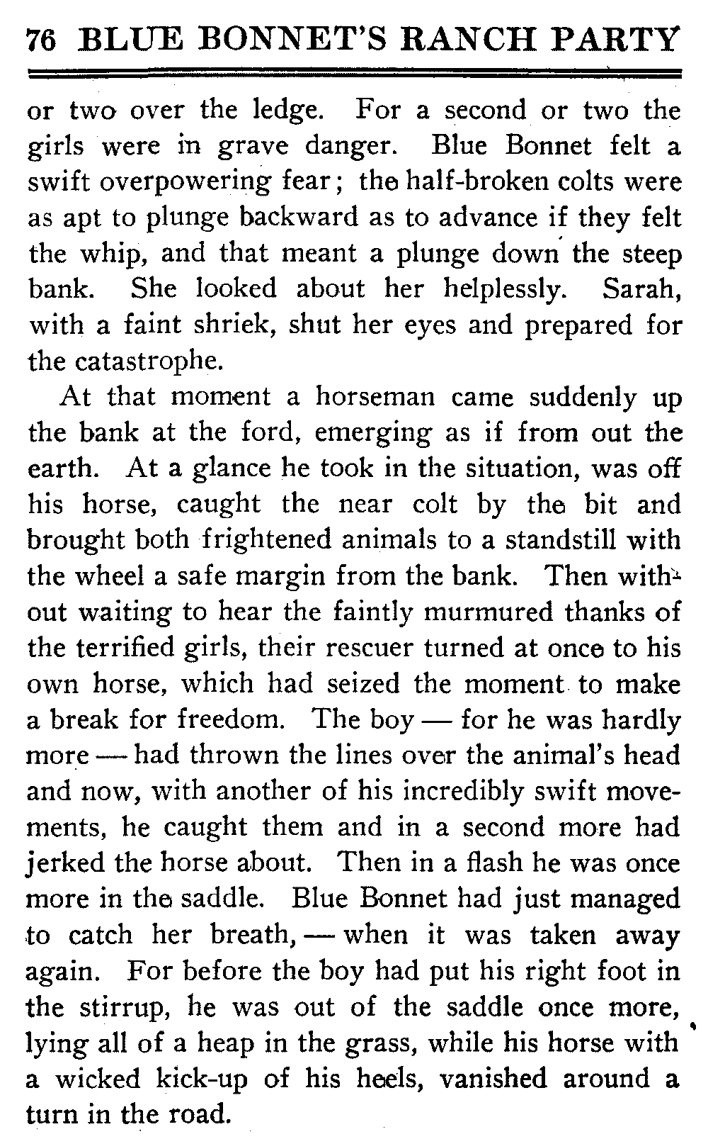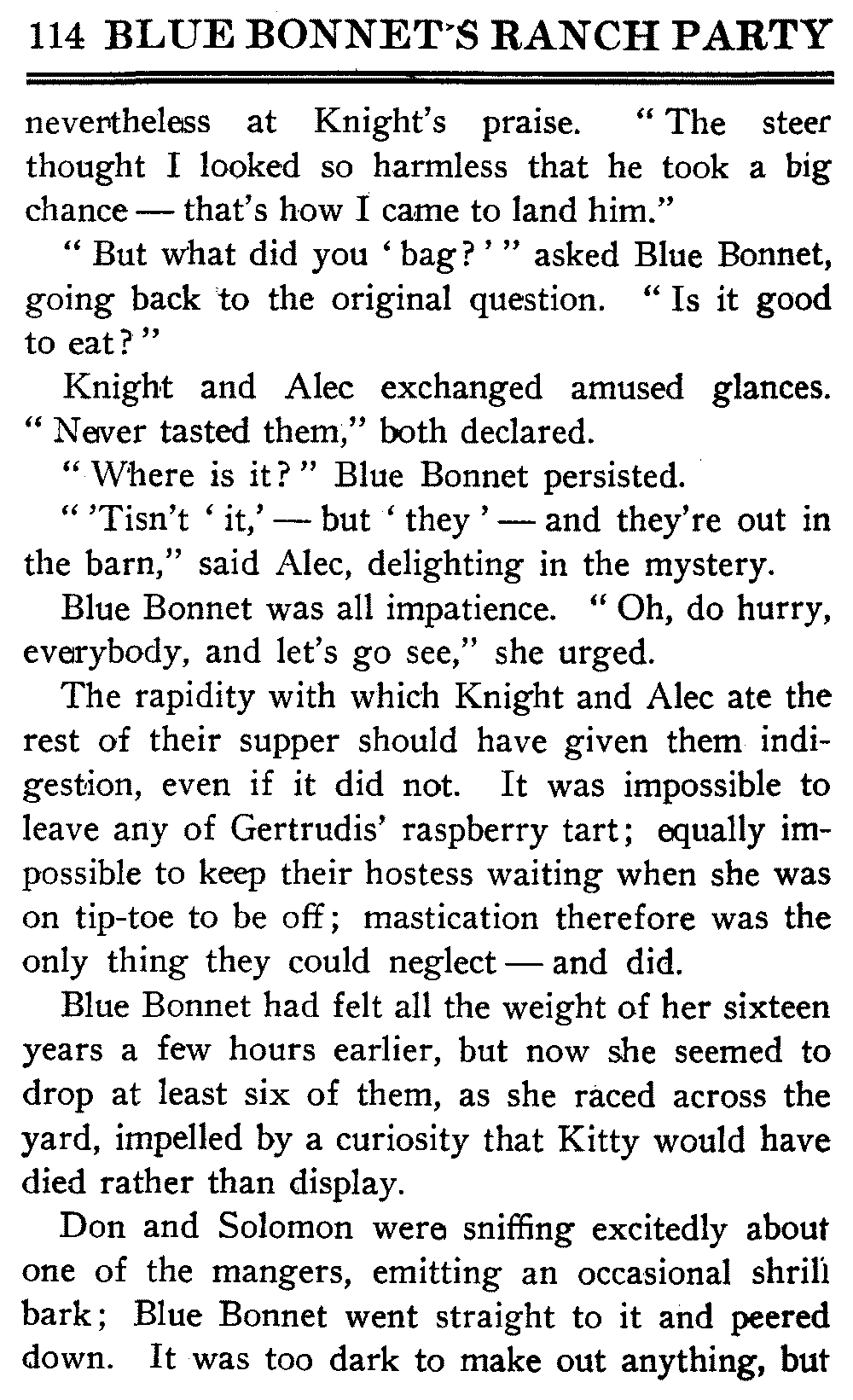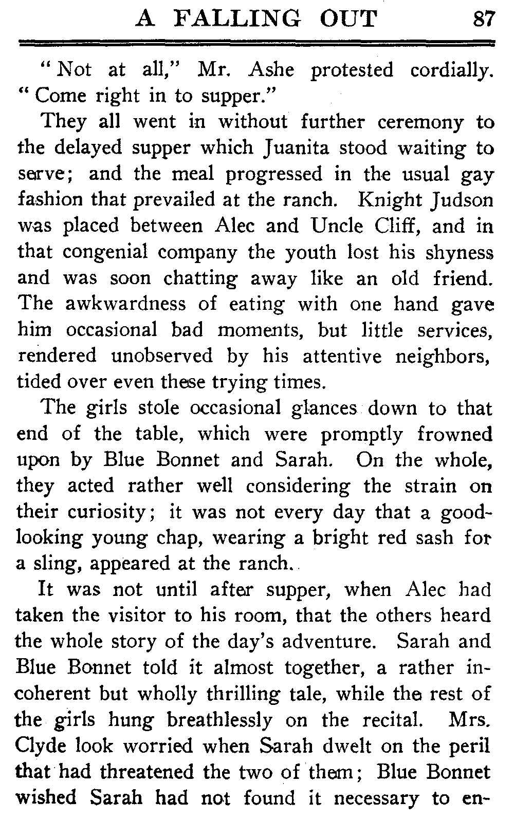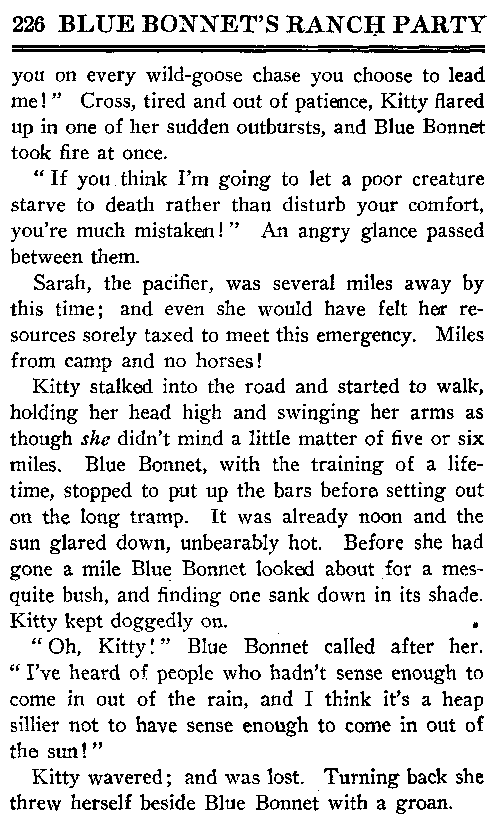 "Oh, I do think a ranch party is the grandest thing in the world," cried Blue Bonnet. "I've read of house parties, but they must be downright tame[4] compared with this kind of a party. And it's not to last just over a week-end either, but two whole months! Why, Uncle Cliff, any ordinary man would be scared to pieces at the prospect."