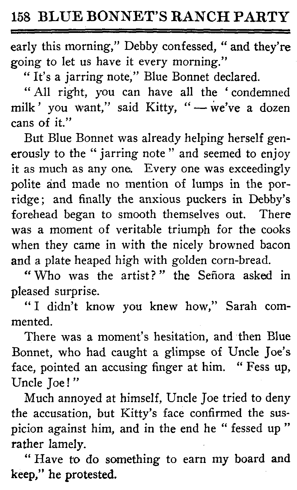 "Benita had better not get petrified this summer," interrupted Uncle Cliff. "She has to do some tall hustling. I've wired Uncle Joe to get extra help while the ranch party is in session. If they can get old Gertrudis from the Lone Star Ranch—she's the finest cook in the state of Texas. And her granddaughter might wait on table."