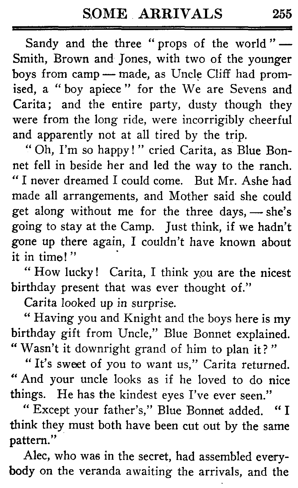 Blue Bonnet had been spending a few days in New York with her uncle, who had insisted that she should have a little "lark" after her long months in school. Now, in a private car belonging to one of Uncle Cliff's friends, they were on their way back to Woodford, there to gather up Grandmother Clyde, Alec Trent, and the other six of Blue Bonnet's "We are Seven" Club, and bear them off to Texas for the summer.