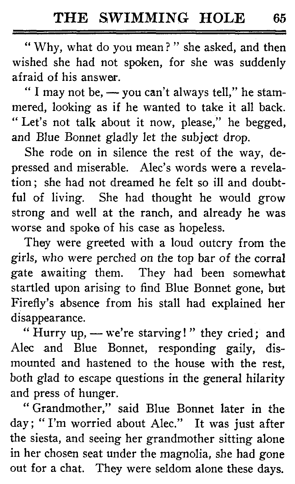 "Dear old Firefly! Won't I make it up to him though! Isn't it queer how many of my wishes have come true? It makes me feel almost—breathless. I no sooner got through wishing I could leave the ranch and go East and be with Grandmother—than I woke up in Woodford. And I wanted—thought I wanted—to be called Elizabeth. Blue Bonnet became Elizabeth!"