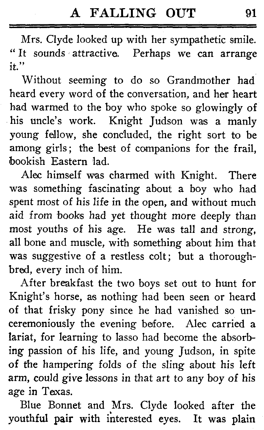 "Nonsense, Honey. That fear died and was buried the day you rode Alec's horse, Victor. A[5] good canter on Firefly over the Blue Bonnet country will make you wonder that such a feeling was ever born."