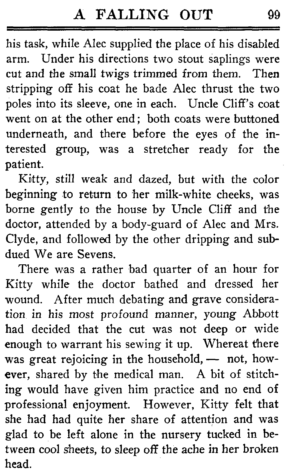 "I know," she confessed. "But it seems as if we'd never get to Woodford. This is the longest-seeming journey I ever took—even if it is in a private car." Then, fearing to appear inappreciative, she added quickly: "But I do think it is mighty good of Mr. Maldon to let us take his very own car. I can just see the We are Sevens' eyes pop right out when they see this style of travelling." Blue Bonnet's own eyes roamed over the luxurious interior of The Wanderer, dwelling with approval[2] on the big, swinging easy chairs, the book-case cunningly set in just over a writing-desk, the buffet shining with cut glass and silver, and the thousand and one details that made the car a veritable palace on wheels.
