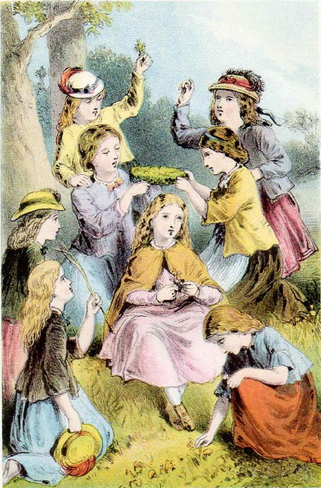 But Nannie's father was only a country doctor, and didn't live in a very large house. You can see for yourself that it is only a white cottage, with green blinds, and a long porch in front, covered with sweetbriar and honeysuckle. But the people that live in the house are quite as pleasant as the house itself, or even as the people that live in the large brick house. After Dr. Merry comes Mrs. Merry, or Nannie's mother, who is, like most mothers, very kind and good; then sister Mary, who is grown up, and Nannie thinks the best sister ever was; then Belle, who is very pretty, and about twelve years old; John and Charlie, who are, like most boys, great teasers, and Nannie sometimes thinks a good deal worse than most boys—but then, Charlie is only four years old, so there is some excuse for him. Lastly, we have Nannie herself, who is—well, we shall find out what she is before our story is finished. She is nine years old, "nearly ten," and would feel offended if we left that out. But here she comes from Grannie Burt's, so we must stop talking about her. She is coming by the lane just as we did, running at first, then a little slower, till at last she stops, for her sister Mary is weeding one of the pretty borders in the little garden.