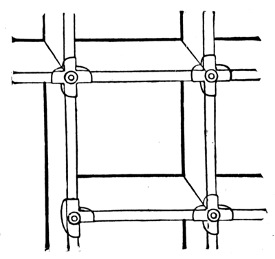 The bottom of the case is fitted into a groove made in the outside frame,[Pg 14] so that it cannot be easily separated. This groove being slightly higher than the lower face of the side frame, upon which the case slides back and forth in the rack, keeps the bottom up far enough to allow it to pass clear of the runs, or of any case or shelf below. The partitions are made by strips across the full width of each section of the case from outer frame to outer frame or to crossbar. The strips are crossed at the corners of the boxes by mortising each piece one half of its depth at the proper place—one from above and the other from below—and dovetailing the cross pieces together. (Fig. 4.) The corners of the boxes are then re-enforced by brass clasps made to fit over the top of the partitions and held by a long pin driven down through the dovetailed partitions and clinched at the bottom of the case. (See Fig. 5.).