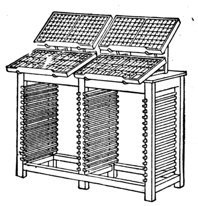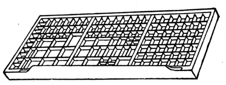 6. Standing Galleys—These are stands with inclined tops divided sometimes horizontally and sometimes perpendicularly into narrow columns, for holding live or dead standing matter—usually the latter awaiting distribution. The lower part of the frame is usually provided with racks for cases, letter-boards, galleys, or other storage facilities.