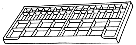 Type cases are made of wood thoroughly seasoned to prevent as much as possible any shrinking after they are finished and have remained for some time in the usually dry air of a composing room. It is not so common a custom now, as it was formerly, to sponge type on the galley before distributing and to allow the surplus water to flow into the case, thus subjecting parts of the case to excessive dampness. The old type cases, under such careless usage, were quickly warped and cracked. The splitting of the bottom and the separation of the partitions allowed small types to drop out and to shift under the partitions. These defects were partially overcome by papering the[Pg 13] bottoms of the boxes, the proper accomplishment of which was at one time considered a part of the compositor's duty.