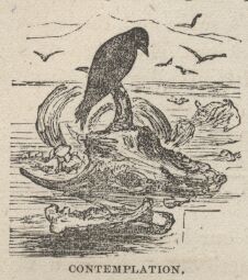 We were coated with it like millers; so were the coach, the mules, the mail-bags, the driver—we and the sage-brush and the other scenery were all one monotonous color. Long trains of freight wagons in the distance envelope in ascending masses of dust suggested pictures of prairies on fire. These teams and their masters were the only life we saw. Otherwise we moved in the midst of solitude, silence and desolation. Every twenty steps we passed the skeleton of some dead beast of burthen, with its dust-coated skin stretched tightly over its empty ribs. Frequently a solemn raven sat upon the skull or the hips and contemplated the passing coach with meditative serenity.