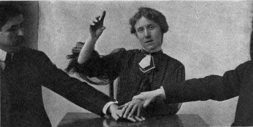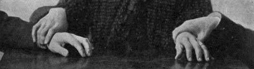 [Pg xii]Plate XI. Method Used by Eusapia to Surreptitiously Free her Hand   Facing page 206