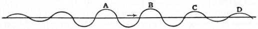The excess of the retardation above that resulting from theory is probably due to a difference between “wave-speed” and “group-speed” pointed out by Rayleigh. Let fig. 5 represent a short series of progressive undulations of constant period and wave-length. The wave-speed is that required to carry a wave crest A to the position of the crest B in the wave time. 626 But when a flash of light like that measured passes through a refracting medium, the front waves of the flash are continually dying away, as shown at the end of the figure, and the place of each is taken by the wave following. A familiar case of this sort is seen when a stone is thrown into a pond. The front waves die out one at a time, to be followed by others, each of which goes further than its predecessor, while new waves are formed in the rear. Hence the group, as represented in the figure by the larger waves in the middle, moves as a whole more slowly than do the individual waves. When the speed of light is measured the result is not the wave-speed as above defined, but something less, because the result depends on the time of the group passing through the medium. This lower speed is called the group-velocity of light. In a vacuum there is no dying out of the waves, so that the group-speed and the wave-speed are identical. From Michelson’s experiments it would follow that the retardation was about 1⁄14 of the whole speed. This would indicate that in carbon bisulphide each individual light wave forming the front of a moving ray dies out in a space of about 15 wave-lengths.