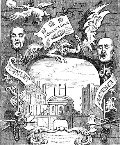 Temple Bar, 1746, copied from an undated print published soon after the execution of the rebel adherents of the young Pretender. The view is surrounded by an emblematic framework, and contains representations of the heads of Townley and Fletcher, remarkable as the last so exposed; they remained there till 1772 | 23 |