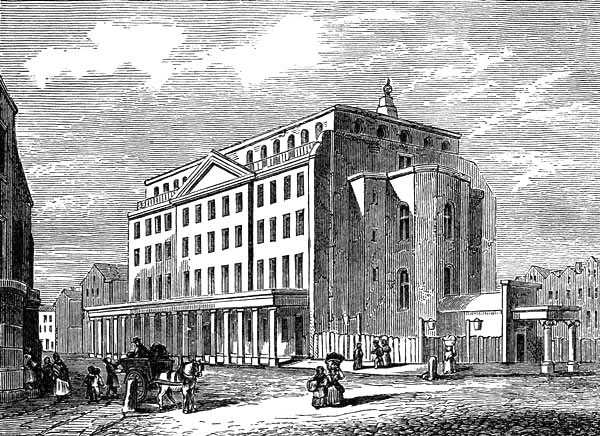 Drury Lane Theatre, 1806, from an original drawing by Pugin. This was the third theatre, succeeding Garrick’s. It was built by Henry Holland, opened March 12, 1794, and burnt down Feb. 24, 1809. It was never properly finished on the side toward Catherine Street, where this view was taken | 347 |