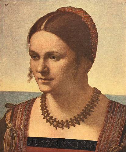 [72] The finest portrait under his name is the "Portrait of a Woman" at Berlin. This indeed is a brilliant piece of portraiture, absolutely modern in feeling, exceeding Holbein; and unless my eyes, which have not rested upon its surface for over ten years, deceive me, it is quite unlike any portrait painted by him before—the nearest perhaps being the man's portrait at Munich of 1507. The picture is supposed to show Venetian influence, and might therefore belong to this epoch; but, to my thinking, documentary evidence alone could make this picture in its not Dürer-like mode of seeing an undoubted work from his hand.