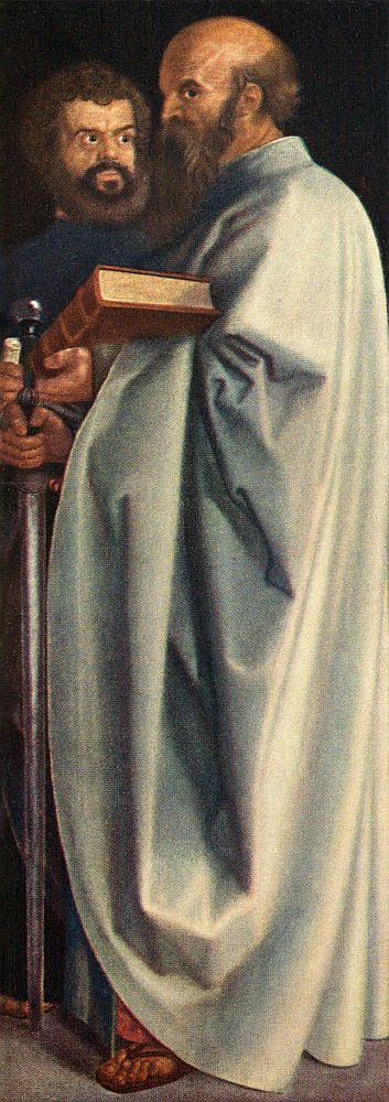 This, with the "SS. Paul and Mark," originally formed one picture, and was painted for the Council of his beloved city, Nuremberg, as a gift, two years before his death. Dürer had inscribed lengthy quotations from the Bible below the picture; these quotations, proving the militant fervour of his Protestant faith, were subsequently removed on that account. Dürer's works were always more than works of Art.