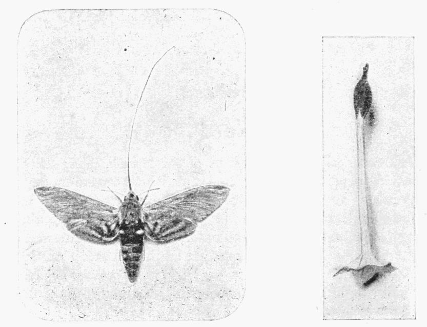 Except that it is generally less prominent, the head, with the various parts thereof, is pretty much the same as in the butterflies. In a few families, however, the "tongue" (proboscis) is only rudimentary or even entirely absent; while in others it is very long. The Convolvulus Hawk-moth has the proboscis of such length that it is able to reach the deep-seated nectary of such tubular flowers as those of Nicotiana affinis. In the illustration the "tongue" of the moth and the sweet-scented tobacco blossom are shown on exactly the same scale.