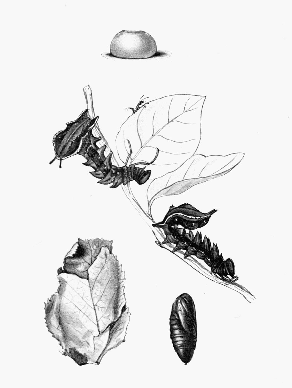 | Eggs, natural size and enlarged; caterpillars and chrysalis. |