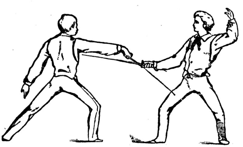 This is another variety of attack. Supposing the adversary's blade to be firmly joined to yours, when you wished to deliver a straight thrust, there would then be danger of your falling upon his point. This danger is avoided by giving a slight beat on his blade the instant preceding your extension of arm, of course to be followed en suite by the longe.