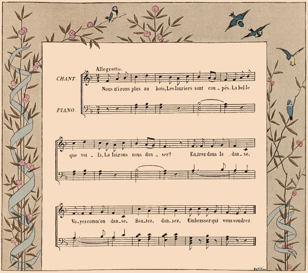 On fait une ronde. L'une des jeunes filles chante seule les deux premiers vers; au troisième, elle quitte la main de sa voisine de droite, et, se plaçant devant sa voisine de gauche, lui prend les deux mains; les autres enfants doivent passer en chantant le refrain sous l'arc qu'elles forment en tenant leurs bras élevés.