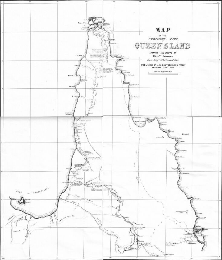 The Settlement of Northern Australia has of late years been of such rapid growth as to furnish matter for a collection of narratives, which in the aggregate would make a large and interesting volume. Prominent amongst these stands that of the Settlement of Cape York, under the superintendence of Mr. Jardine, with which the gallant trip of his two sons overland must ever be associated. It was a journey which, but for the character and qualities of the Leader, might have terminated as disastrously as that of his unfortunate, but no less gallant predecessor, Kennedy. A brilliant achievement in exploration, in a colony where exploring has become common and almost devoid of interest, from the number of those yearly engaged in it, its very success has prevented its attracting that share of public attention to which its results very fully entitled it. Had it been attended with any signal disaster, involving loss of life, it would have been otherwise. Geographically, it has solved the question hitherto undecided of the course of the northern rivers emptying into the Gulf of Carpentaria, of which nothing was previously known but their outlets, taken from the charts of the Dutch Navigators. It has also made known, with tolerable definiteness, how much, or rather, how little, of the "York Peninsula" is adapted for pastoral occupation, whilst its success in taking the first stock overland, and forming a cattle station at Newcastle Bay, has insured to the Settlement at Somerset a necessary and welcome supply of fresh meat, and done away with its dependence for supplies on importations by sea of less nourishing salt provision.