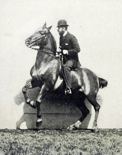 | The Gallop-change from Right to Left. The horse, having been in gallop right, has just gone into air from the right fore leg. The right hind leg was then planted, which will be followed in turn by the left hind leg, then the right fore leg, and lastly the left fore leg, from which the horse will go into air; the change from gallop right to gallop left having been made without disorder or a false step | Frontispiece | |