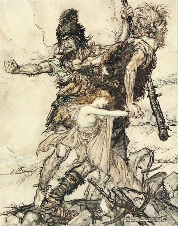 Fasolt suddenly seizes Freia and drags her to one side with Fafner plate 08