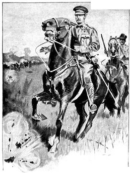 On the morning of the 15th Lord Kitchener and General Kelly-Kenny rode round the cavalry camps. The field batteries and two naval guns replaced and set free the Horse Artillery. One of the naval 12-pounders was stationed upon a kopje overlooking the drift, after an incident which well illustrated the resourcefulness of our bluejackets. "On moving the gun," says a correspondent, "one of the wheels collapsed; but the sailors lifted the gun from its carriage, and hauled it a distance of two miles to the top of the kopje. It was a great performance, and well deserved the thanks which Lord Kitchener conveyed to them." The tired infantry went on outpost duty instead of the cavalrymen, and after breakfast the three cavalry brigades and the seven horse batteries drew up and moved out with definite orders to reach Kimberley that night. The sight, as the endless line of cavalry rode off across the veldt, about 9 a.m., was a very fine one. On the left was Broadwood with his Hussars, Lancers, and heavy Household Cavalry; in the centre was General Porter, just arrived, with his Dragoons; on the left Gordon with the Lancers' gay pennons and the more sombre squadrons of Roberts' Horse. Scarcely had the line left the river—heading[Pg 356] directly to the east with the object of deceiving the enemy, and leading them to suppose that the object of the ride was Bloemfontein rather than Kimberley—when a Boer gun opened fire on the British left, sending several shells among the cavalry. At once two batteries of Horse Artillery went rattling to the front, deployed, and returned the fire. The three field batteries from Klip Drift also pushed out to support General French. The Horse Artillery suffered considerable loss, thirteen officers and men being killed or wounded. The cavalry extended to the right, when from kopjes on the left front as well as the left flank and left rear came a heavy fire from what was evidently a large force of Boers; on the right front upon a kopje the enemy also showed in some strength. It was now that General French had an opportunity to show his skill and generalship. Without any hesitation he gave General Gordon orders to charge with his men and clear a nek between the kopjes. The nek was about 2,500 yards wide, smooth, and level. At the same time the Horse Artillery was ordered to scourge the kopjes with shrapnel.