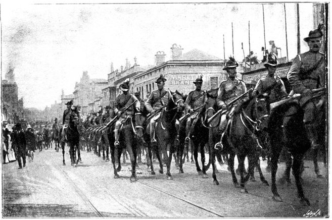 RECEPTION OF THE 16th LANCERS, CAPE TOWN.The 16th Lancers, who did such excellent work on February 15, were dispatched from India to South Africa on the application of Lord Roberts. On their arrival at Cape Town a request was made that the regiment should march through the town. The request was granted, and the fine regiment, whose list of battle honours is surpassed by no other cavalry regiment, and equalled only by one, was received with the wildest enthusiasm.