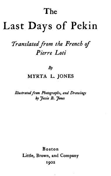 The Project Gutenberg EBook of The Last Days of Pekin, by Pierre Loti This eBook is for the use of anyone anywhere in the United States and most other parts of the world at no cost and with almost no restrictions whatsoever. You may copy it, give it away or re-use it under the terms of the Project Gutenberg License included with this eBook or online at www.gutenberg.org. If you are not located in the United States, you'll have to check the laws of the country where you are located before using this ebook. Title: The Last Days of Pekin Author: Pierre Loti Illustrator: Jessie B. Jones Translator: Myrta L. Jones Release Date: June 3, 2015 [EBook #49121] Language: English Character set encoding: ISO-8859-1 *** START OF THIS PROJECT GUTENBERG EBOOK THE LAST DAYS OF PEKIN *** Produced by Moti Ben-Ari and the Online Distributed Proofreading Team at http://www.pgdp.net (This file was produced from images generously made available by The Internet Archive)