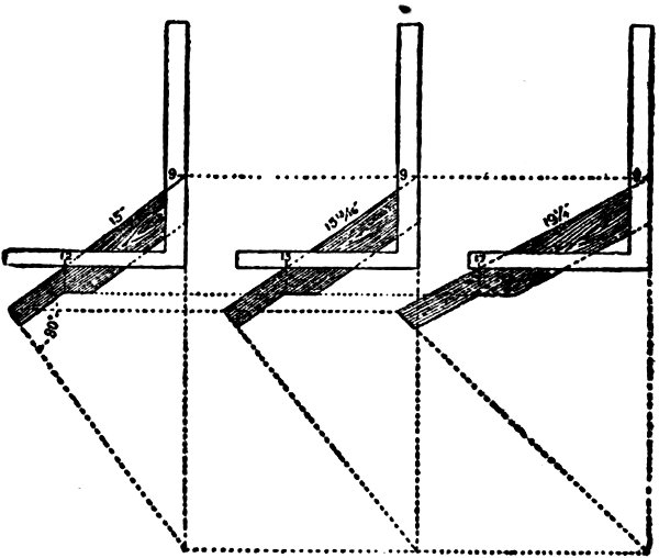 If we want a brace with a two-foot run, and a four-foot run it must be evident that, as two is the half of four, so on the square take 12 inches on the tongue, and 6 inches on the blade, apply four times, and we have the length, and the bevels of a brace for this run.