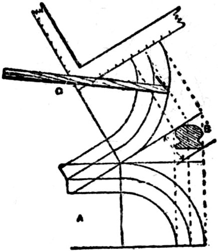To get out the face mold, procure a piece of thin stuff. Three-ply wood is excellent, as though it is liable to warp it does not shrink perceptibly. Shoot on edge and gauge on a center line; take the distance from B to D (Fig. 84) (the hypothenuse of 6 and 6) on the blade and the rise (10½) at D on the tongue; lay on the edge 122 of the board to this. Lay off this length on the three-ply at B D (Fig. 82); take the width B C (Fig. 84) on the blade, rise at C on the tongue; find the hypothenuse, and apply with a pair of compasses at Fig. 82 with B as a center cutting at C. Then apply at D as a center, cutting at A. Now find the hypothenuse C to D (Fig. 84), and apply the compasses as before, with D and B as centers, cutting at A and C. Connect up the points where the arcs intersect to B and D; this is the face of the inclined prism, and contains the true shape of rail. Continue the tangent line C B, 3 inches or whatever is required for the shank, and square the joints of the lines B and D. In order to locate the major axis the horizontal trace is now required. Stand the bed block on the plan (see Fig. 83). Run the blade of the square down until it touches the board; mark this, and remove the block. It will be seen that the bed block has not got the 3 inches allowed at the bottom, but the horizontal trace is as easily found with as without the allowance; all that is required in the former case being to turn the blade to B (still keeping the heel at the top of the bed block), make a mark where the square touches and lay on the square as shown at Fig. 83. Mark at the blade, and slide back the square until the tongue touches 123 at B, and also at the center A. This gives the true horizontal trace and major axis. Note the size indicated by the arrow lines on the tongue (from heel to B). Transfer the square to the three-ply board (Fig. 82), placing it as shown, with the blade touching A, and the distance of the arrow lines at B. Mark along the inside of the blade of the square and slide the square back until the tongue cuts at A. This gives the minor axis. Now continue this line downwards to guide the position of the square shown at Fig. 84. Describe a circle as wide as the rail on the minor axis (Fig. 82). The distance from A (Fig. 84) to the center of the rail is the distance to apply at Fig. 82 for the center of the rail, as this is the point where the center of the rail is fair with the plank. Obtain the width of the face molds, and apply at B and D; lay the square on the major and minor axis as shown at Fig. 84. Lay a lath on the square, with the point touching the outside of the circle at C; drive in a nail at the heel of the square; shift the lath until the point lies at B, and drive in another nail at the side of the square. This trammel is now ready to sweep the outside of the mold, which is done by reversing the square, as shown by dotted lines. Pull out the nails and repeat the process for the inside of the mold.