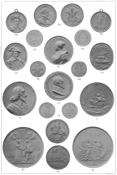 There are no medals which indicate the early contest between Charles I. and the Parliament, those which are issued before 1640 referring for the most part to the royal family and to eminent persons, with the exception of the Scottish coronation medals of 1633 and those commemorating the settlement of the Dutch Fishery question in 1636. After the Declaration of Parliament in 1642, when the country was divided into two parties, a new era in its medallic history begins, and medals are struck in extraordinary numbers. This continues during the period of the Civil War, and, besides medals which record the successes of both parties, there is a large number of Royalist and Parliamentarian badges, with portraits of the generals and statesmen on both sides. Fortunately, England at this time produced several artists, whose works are fitted to take the first rank in the national series. These artists were Thomas and Abraham Simon, who worked for the Parliament, and Thomas Rawlins, who was in the service of the King. The series of this reign ends with several examples of the badges worn by those who sympathised with the royal cause and with a few medals x recording the King's death. With the period of the Commonwealth the issue of royalist badges ceases, and for the next ten years the medals are of the parliamentarian class. These consist of portrait medals of the Protector, of his family, and of the leading statesmen and generals, and also of military and naval rewards, for the most part executed by the two Simons. The Dunbar medal (Nos. 149—150), which was issued for distribution among those engaged in that battle, is the first authorized military decoration known. It was struck by order of the Parliament immediately after the engagement. Naval medals were also issued on several occasions, the most important being those for Blake's victories over the Dutch in 1653 (Nos. 155—158). The Commonwealth series closes with several medals, English and Dutch, commemorating the death of the Protector, and also with a few personal medals, chiefly by the Simons.