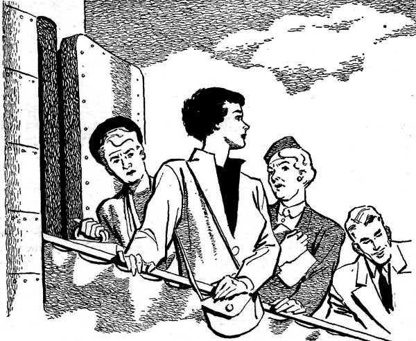 Sitting rigid in the tense stillness of a rocket ship that was about to leap from Earth, Marcia started as an officer ducked his head into the passenger compartment from the pilot room's deep glow. But it wasn't Jack. The officer's lips moved hurriedly as he counted over the seats. He ducked back out of sight. From the bulk-heads, the overhead, everywhere, came a deep, quiet rumble. Some of the passengers looked anxious, some excited, and some just leafed casually through magazines.