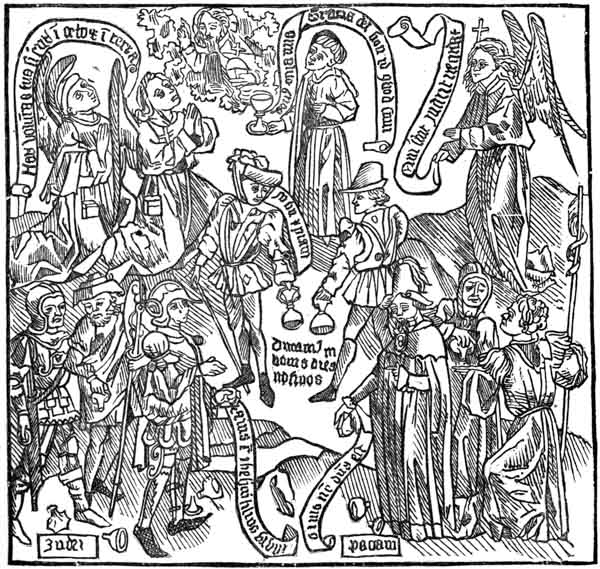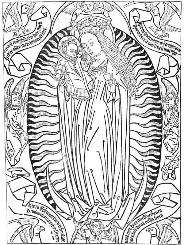 407 Some engravers on wood who would not work with typographers undertook a new branch of printing—the making of prints, thirty or forty inches long, for the decoration of interior walls. Becker has published a collection of these large prints, taken from the original blocks, some of which he says were made before 1500. See cut on page 535.