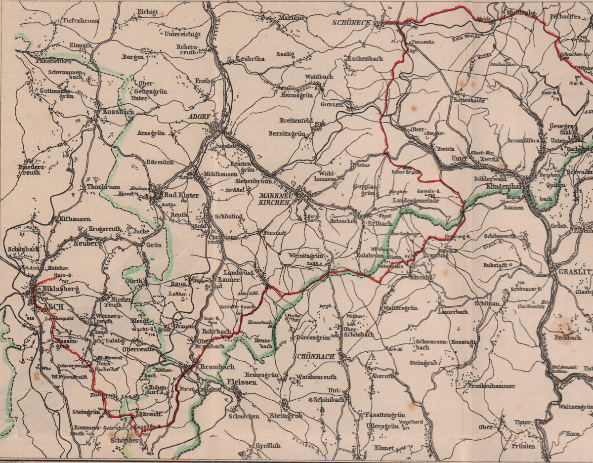 Zugangswege: Aus Sachsen und Böhmen: Eisenbahnlinie Eger–Adorf mit Station Brambach.