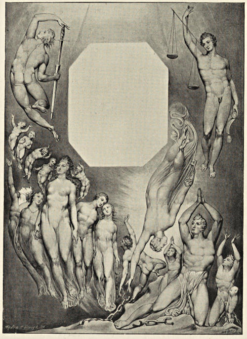These drawings were mostly executed in 1819 and 1820. In the latter year Blake lost his chief patron Butts, whose walls, indeed, had become so crowded with his works that he had almost ceased to give him commissions. The greater part of the collection was dispersed in 1852, but the zeal of Mr. W. M. Rossetti traced most of its constituents out, and reference to his notes, printed in the second volume of Gilchrist’s biography, will enable us to convey some faint notion of its manifold[62] opulence. Putting the Job aside for the present, the most remarkable appear to be the nine designs for Paradise Lost, the property of Mr. J. C. Strange, in which, says Mr. Rossetti, Blake is king of all his powers of design, draughtsmanship, conception, spiritual meaning, and impression. Another set, belonging to Mr. Aspland, of Liverpool, omits one subject and adds four. Another set of Miltonic designs for Comus, rather distinguished by grace than grandeur, has been recently published by Mr. Quaritch. Another set of no less than one hundred and eighteen designs for Gray’s works, in 1860 in the possession of the Duke of Hamilton, are reputed to rank among Blake’s finest productions, but have not been inspected by any one competent to describe them. Among others especially commended by Mr. Rossetti are The Sacrifice of Jephthah’s Daughter, Ruth, The Judgment of Paris, The Wise and Foolish Virgins, Fire, Famine, Samson subdued, The Finding of Moses, Moses erecting the Brazen Serpent, The Ghost of Samuel appearing to Saul, The Entombment, The Sealing of the Sepulchre, The Angel rolling the Stone from the Sepulchre, The River of Life, and Hecate. To these may be added The Resurrection of the Dead, now in the British Museum, reproduced by us. Many others, not belonging to the Butts collection, are described with equal enthusiasm; and, apart from all questions of technical execution, usually splendid, but lost upon those who have not access to the original works, it may be said that the conceptions, as described by Mr. Rossetti, would be impossible to one unendowed with the highest artistic imagination, and that the body is worthy of the spirit.