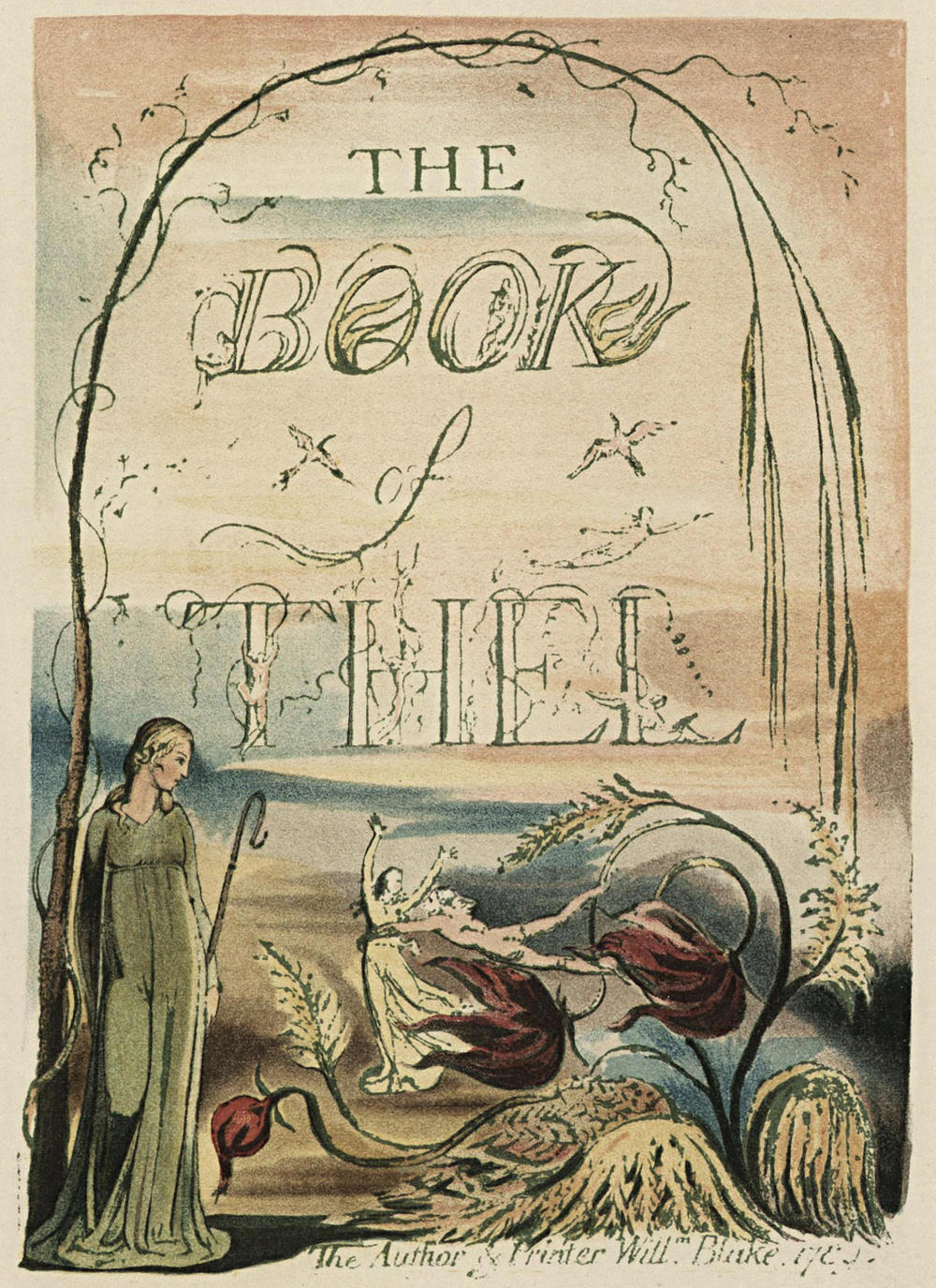 The strictly literary criticism of Blake’s mystical books may be almost confined to the Book of Thel, for this alone possesses sufficient symmetry to allow a judgment to be formed upon it as a whole. The others are like quagmires occasionally gay with brilliant flowers; but Thel, though its purpose may be obscure, is at all events coherent, with a beginning and an end. Thel, “youngest daughter of the Seraphim,” roves through the lower world lamenting the mortality of beautiful things, including her own. All things with which she discourses offer her consolation, but to no purpose. At last she enters the realm of Death himself.