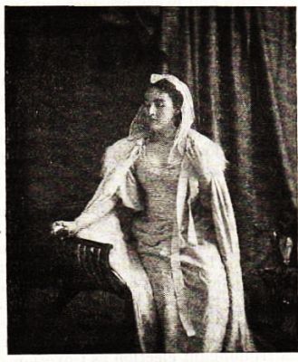 [An impression of space may be produced in two ways, either by hanging a background canvas, whereon is painted a perspective of counters, draperies, potteries, etc., or by the use of mirrors. As scene-painters do not grow on every twig, the better plan is to borrow long mirrors from a house-furnishing establishment, and arrange them so that they reflect a section of the stage behind the curtained pole. This section can be made to look as if sales of small articles were going on at another end of the shop from that in the foreground of stage. But take care that no part of the real stage setting is reflected. A pantomimic repetition of the play would bring down the house, and as certainly disturb the performers. Do not crowd the stage.]
