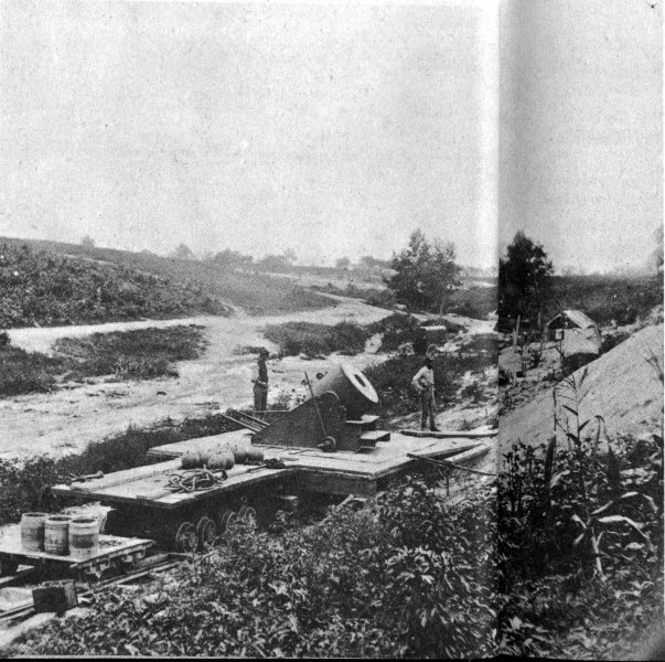 The “Dictator,” also called “The Petersburg Express,” was a 17,000-pound, 13-inch Federal seacoast mortar mounted on a reinforced railroad car. During the early part of the siege, this huge weapon fired 200-pound explosive shells into Petersburg, 2½ miles away, from a curved section of the Petersburg and City Point Railroad. On July 30, 1864, it was part of the artillery support for Union troops during the Battle of the Crater.