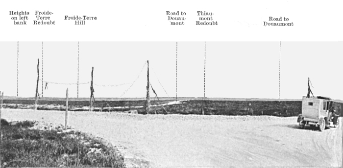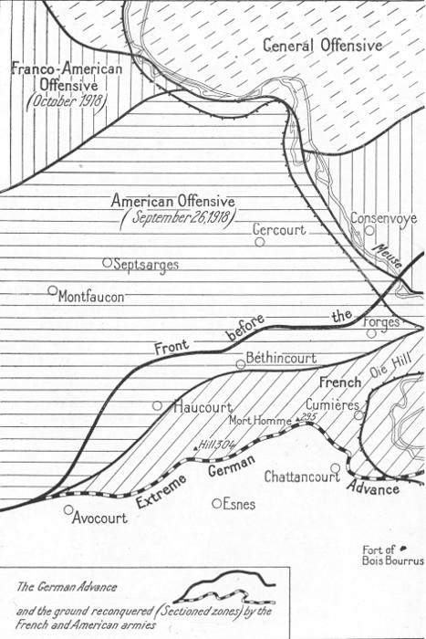 Taking over the command on the night of the 25th, General Pétain at once divided the battle-line into four sectors, officered as follows: General Bazelaire, on the left bank, from Avocourt to the river; General Guillaumat, from the Meuse to Douaumont; General Balfourier, from this point to the Woevre; General Duchesne, on the Meuse Heights.