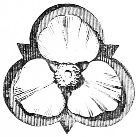 the growth of the anemone. The plant may be found in flower during the months of March, April, and May, the blossoms being pure white, with a bright yellow centre, and the outer surface of the sepals of a delicate purple tinge. It abounds in moist woods throughout the country, generally in such profusion as to cover large tracts of ground with a snowy whiteness; and the plant being perennial, we shall, when it is once established in any spot, find it regularly recurring as each spring-time comes round. The manner of growth of the anemone is very distinct and characteristic, and not being subject to any variation, cannot well be{12} modified in the employment of the plant in ornamental art without destroying its individuality, as from the single stem thrown up from the ground three equal-sized leaves, identical in form, are produced from a point about six inches from the soil, and the stalk is then continued for about the same distance again before bearing at its summit its single flower; each and every plant, therefore, consists of a central stem, a terminal flower, and about midway up the stem a group of three leaves. This rigid law, though extremely beautiful in itself, and admirably adapted for treatment for some ornamental purposes, may, perhaps, somewhat restrict its use in decorative art. We are not aware of any examples of its employment in past art. In our illustration, the plan of the plant, the view with which we are most familiar, as we see it in its natural position, is shown, having the single central flower, and below it the three leaves radiating from the stem. It will be found that this strong individuality of growth more especially adapts itself to the trefoil, or any other form based on the figure three.[A] The garden-anemone (A. coronaria) is an allied species of the same family, modified by cultivation: in its wild state it is a native of the South of Europe.
