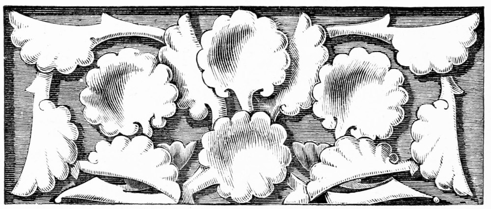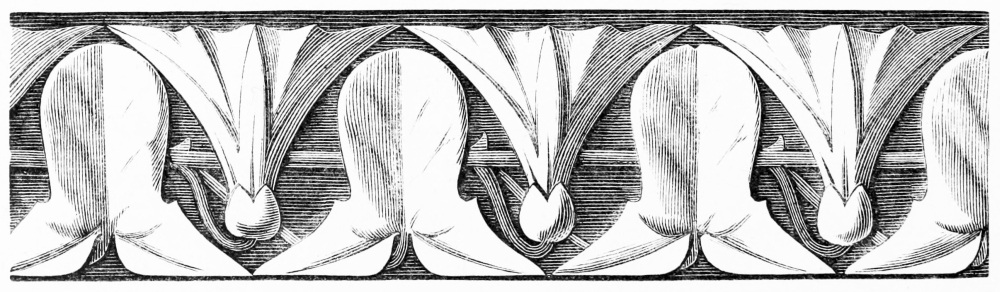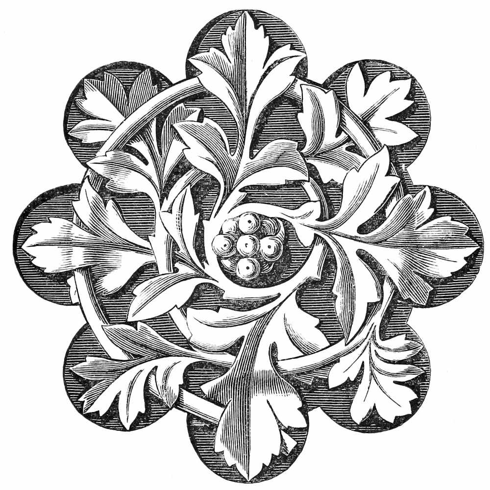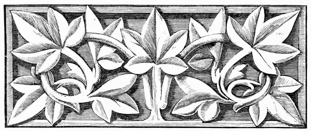 “In the multitude of counsellors there is safety;” we will, therefore, here quote some few passages from the works of those whom we think we can all agree are entitled to speak with authority and to be heard with respect. Ruskin, in speaking on this subject, says,—“All noble ornamentation is the expression of man’s delight in God’s work;” and again, “Ornamentation should be natural, that is to say, should in some degree express or adopt the beauty of natural objects; it does not hence follow that it should be an exact imitation of, or endeavour to supersede, God’s work; it may consist only in a partial adoption of, and compliance with, the usual forms of natural things, without at all going to the point of imitation, and it is possible that the point of imitation may be closely reached by ornaments which nevertheless are entirely unfit for their place, and are the signs only of a degraded ambition and an ignorant dexterity. Bad decorators err as easily on the side of imitating nature as of forgetting her, and the question of the exact degree in which imitation should be attempted under given circumstances is one of the most subtle and difficult in the whole range of criticism.” Wornum thus defines the difference between naturalism and conventionalism: “A natural treatment implies natural imitation and arrangement, but an ornamental treatment does not necessarily exclude imitation in the parts, as, for instance, a scroll may be composed{9} of strictly natural parts, but as no plant would grow in an exactly spiral direction, the scroll form constitutes the ornamental or conventional arrangement; we may, however, have conventionalism of details as well as conventionalism of arrangement.” Hudson says,—“There is a great difference between the terms applied and adapted; they, in fact, express the wrong and the right use of vegetable forms. All natural forms require certain modifications to adapt them for other than their own natural situations, and it is the neglect of this, and the simple application of these forms without adapting them, which constitute a false principle.” Dresser thus illustrates the difference: “Mere imitation is not ornamentation, and is no more art in the higher sense of the term than writing is itself literature. Vegetable nature treated conventionally will not be found to be far removed from truth, but will be merely a natural form, or a series of natural forms, neither marred by blights nor disturbed by winds, adapted to the fulfilment of a special purpose, and suited to a particular position—for the most perfect examples of what is usually termed conventionalised nature are those which express the intention of nature, if we may thus speak, or are manifestations of natural objects as undisturbed by surrounding influences and unmarred by casualties.” In the same way we might bring forward passages from the works of Owen Jones, Sir Gardiner Wilkinson, and many others, in illustration of our remarks; enough, however, has, we trust, been brought forward to confirm the position taken up.