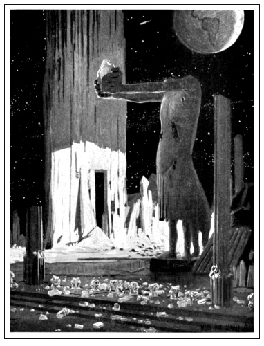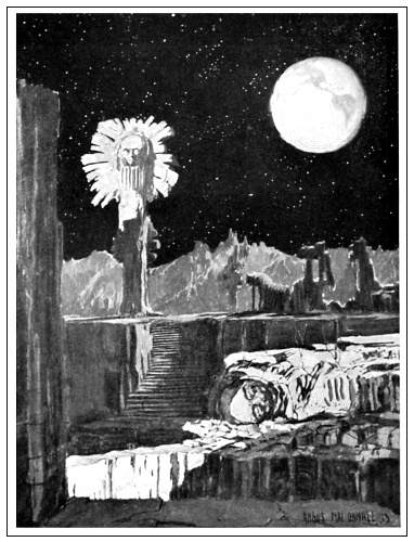 The story was simply told. He started at night for the red planet. He got there and he landed. The air seemed much like ours. But he found himself in a world quite different from his own. All was architecture; temples, towers and enormous viaducts fading away into the horizon, as far as the eye could see. And everything was tall and slender. The trees were very high with branches pointing upward like poplars, and always formally laid out in avenues, or in geometric patterns. And the color! It was like looking at an endless city through orange glasses. The few people he saw had larger heads than ours, more like children, but like children with very short legs. They were surprisingly light on their feet. He was surprised at their high jumps until he remembered that a man who weighs two hundred pounds on the earth weighs but seventy-five pounds on Mars. He really saw but little, however, for although he had tested the atmosphere he[296] found, after looking about him a moment, that the air, while pleasant enough to breath, was affecting his nerves and brain, almost like laughing gas. Then, as he stood there, and began to realize his danger, the wonderful thing happened!