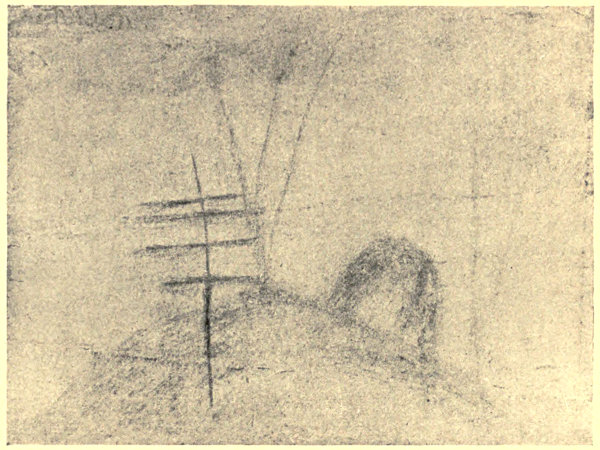 Another instinct of the child is the use of pencil and paper. All children like to express themselves through the medium of form and color. If you simply indulge this interest by letting the child go on indefinitely, there is no growth that is more than accidental. But let the child first express his impulse, and then through criticism, question, and suggestion bring him to 58consciousness of what he has done, and what he needs to do, and the result is quite different. Here, for example, is the work of a seven-year-old child. It is not average work, it is the best work done among the little children, but it illustrates the particular principle of which I have been speaking. They had been talking about the primitive conditions of social life when people lived in caves. The child’s idea of that found expression in this way: the cave is neatly set up on the hill side in an impossible way. You see the conventional tree of childhood; a vertical line with horizontal branches on each side. If the child had been allowed to go on repeating this sort of thing day by day, he would be indulging his instinct rather than exercising it. But the child was now asked to look closely at trees, to compare those seen with the one drawn, to examine more closely and consciously into the conditions of his work. Then he drew trees from observation.