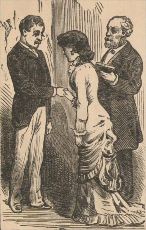 The detectives then went to the parsonage of the Grove Reformed Dutch Church, where they found the Rev. Dr. Mabon. He recollected having married a couple on May 3d. The woman, he said, entered his residence alone, leaving the man in the yard, where he paced up and down as if absorbed in meditation. The woman asked Mr. Mabon if he would perform a marriage, and upon being told yes, she went out and returned immediately with the man. As the couple had not provided a witness, the clergyman called in John Schuman, a barber in Union street, Union Hill.22 The man and woman made satisfactory replies to the usual questions, and they were married in legal form. After the ceremony they subscribed the following record of the marriage, which is now in Mr. Mabon’s possession:
